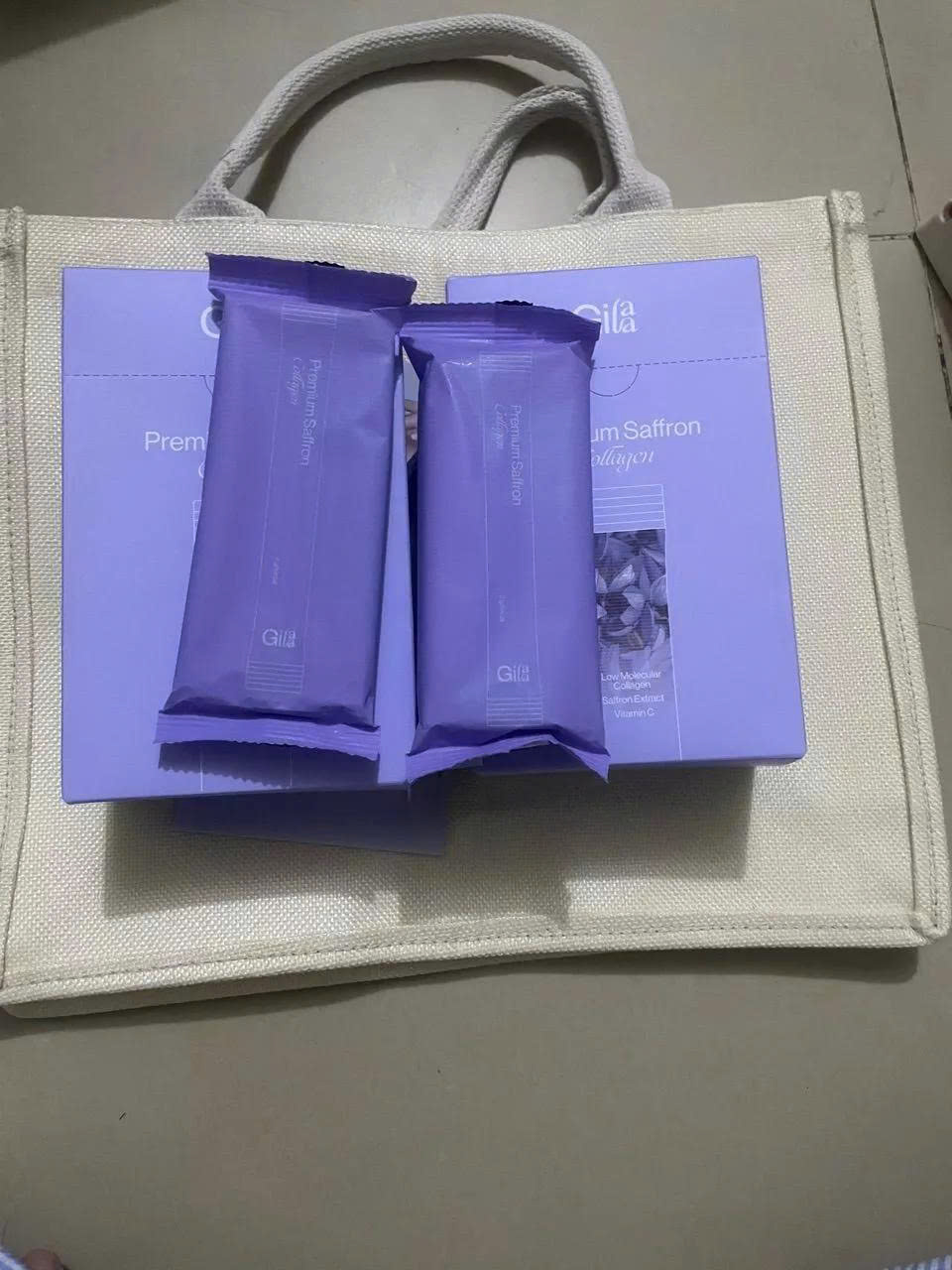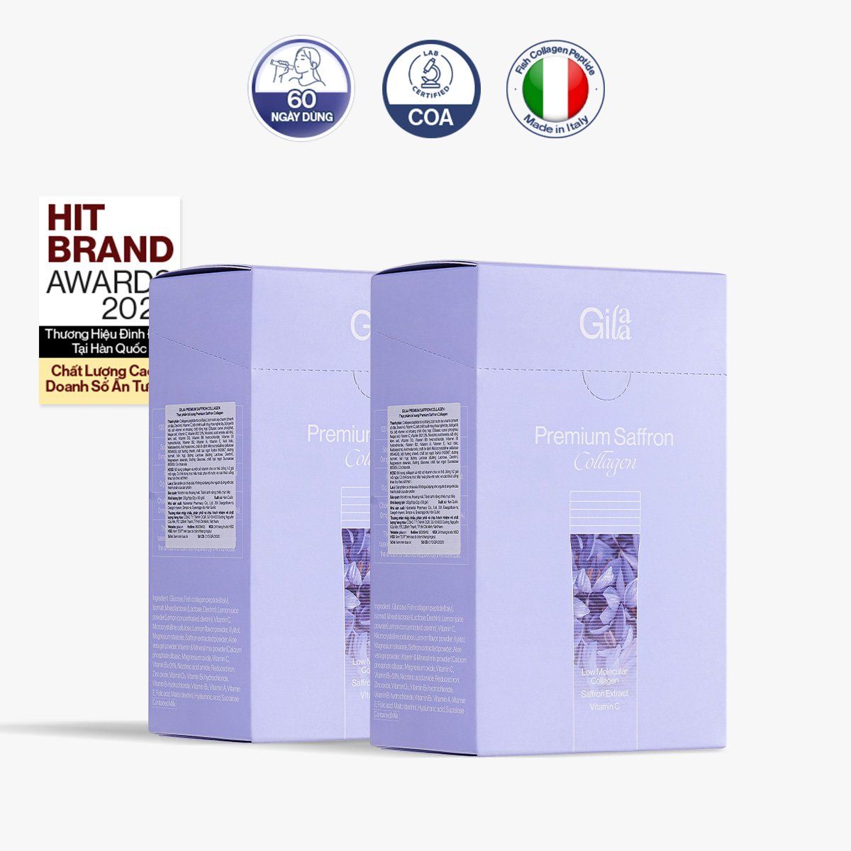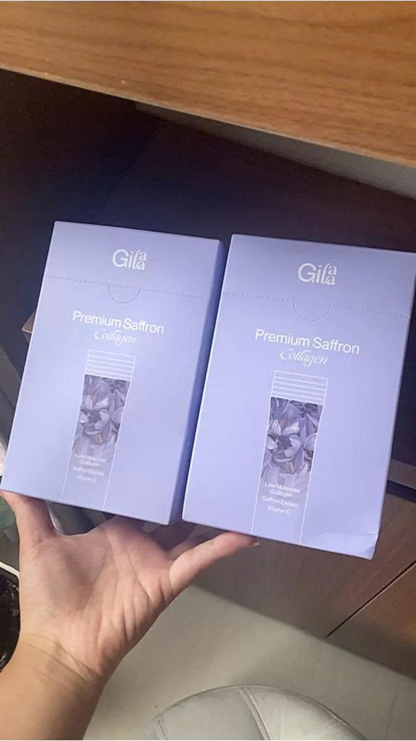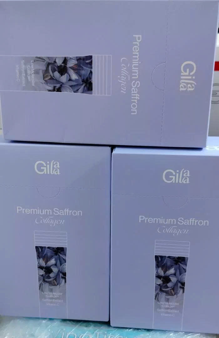 Trong 2 gói Gilaa Premium Saffron Collagen kết hợp các thành phần cao cấp hỗ trợ bổ sung collagen & dưỡng chất từ sâu bên trong, giúp da duy trì độ căng bóng trắng khỏe