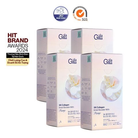 Combo Thực Phẩm Bổ Sung Gilaa 5K Collagen Bight Booster With Saffron Và Gilaa 5K Collagen Inner Booster With Peony áp dụng Công Nghệ Hydro-Booster hiện đại, giúp thủy phân Collagen (từ cá) thành đơn vị siêu nhỏ chỉ từ 300Da trở xuống (nhỏ hơn 10 lần Collagen Peptide thông thường) nên hỗ trợ hấp thụ vào cơ thể nhanh hơn, giúp bổ sung collagen hỗ trợ da săn chắc, giảm chảy xệ.
