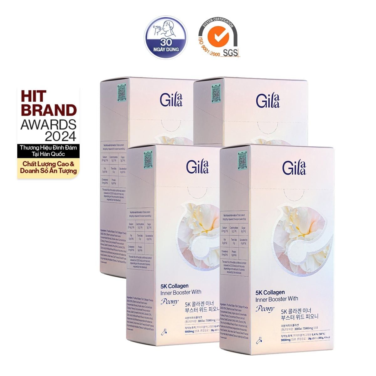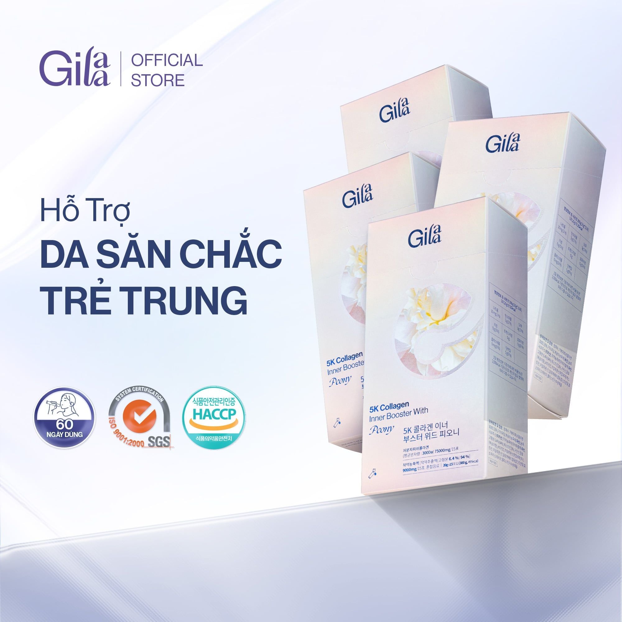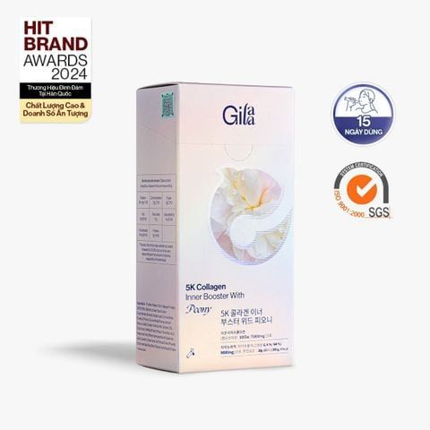 Trong 1 gói Gilaa 5K Collagen Bright Booster With Peony với thành phần chính là 5,000mg Collagen Phân Tử 300Da, kết hợp Elastin, HA & Peony. Sản phẩm giúp bổ sung collagen & dưỡng chất cần thiết, hỗ trợ da tăng đàn hồi săn chắc & sáng mịn từ sâu bên trong.