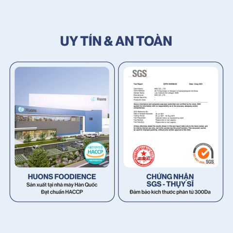 + Kích thước phân tử Collagen 300Da được tổ chức kiểm định SGS Thụy Sĩ xác nhận