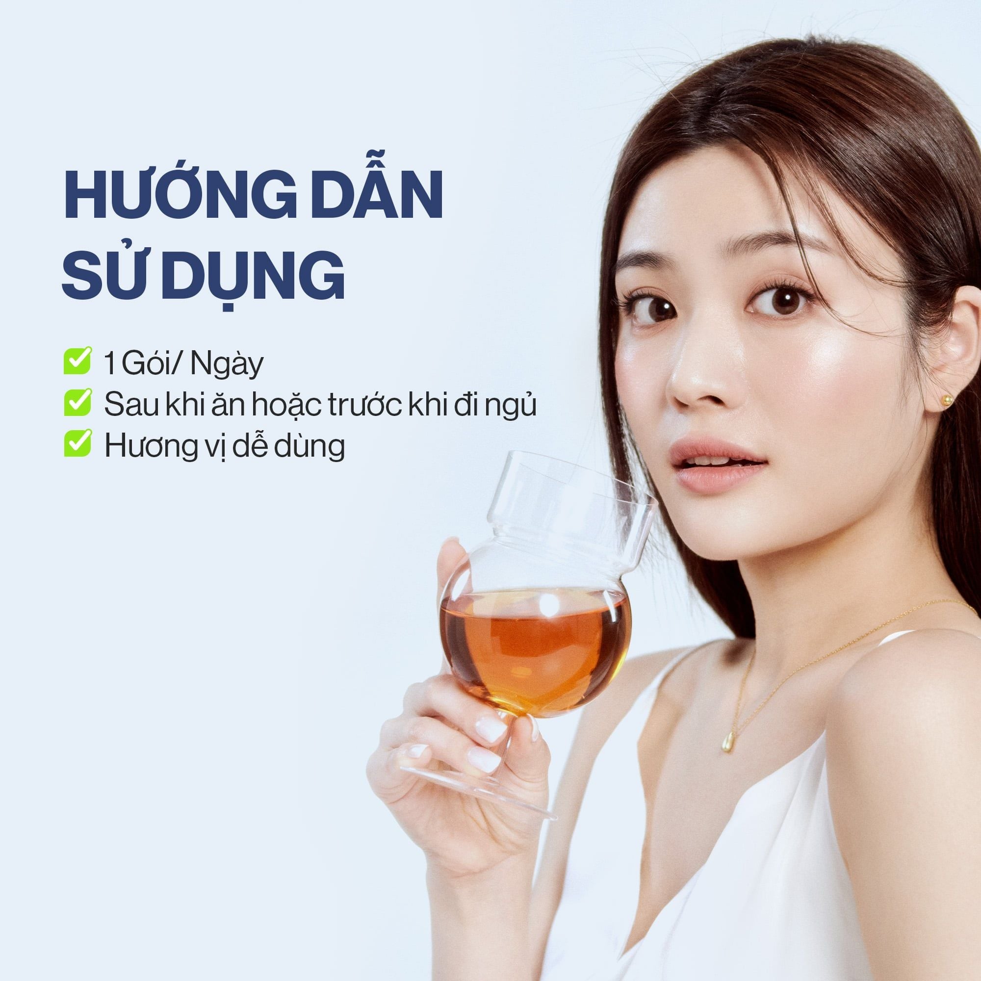 - Sử dụng 1 gói mỗi ngày, có thể dùng trực tiếp hoặc pha với nước và các thức uống khác tùy theo sở thích