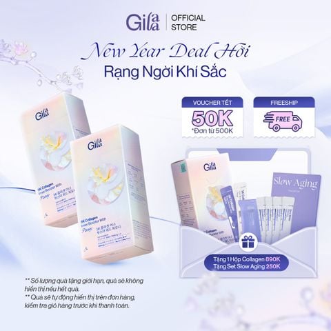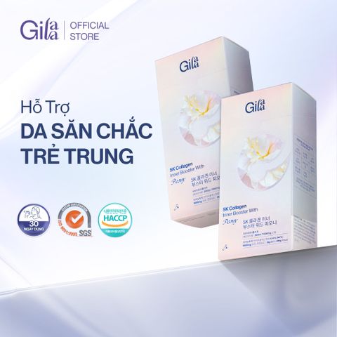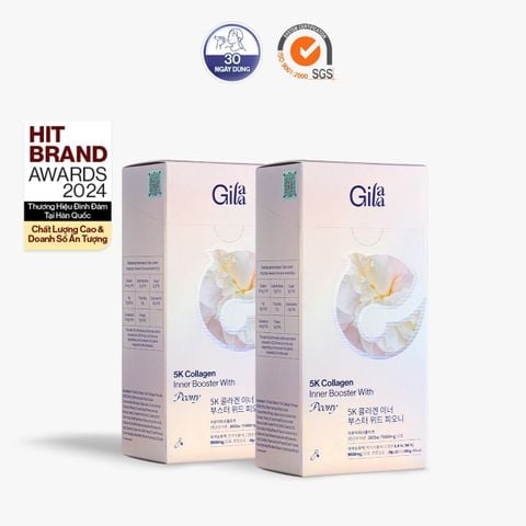 Combo Thực Phẩm Bổ Sung Gilaa 5K Collagen Bight Booster With Saffron Và Gilaa 5K Collagen Inner Booster With Peony áp dụng Công Nghệ Hydro-Booster hiện đại, giúp thủy phân Collagen (từ cá) thành đơn vị siêu nhỏ chỉ từ 300Da trở xuống (nhỏ hơn 10 lần Collagen Peptide thông thường) nên hỗ trợ hấp thụ vào cơ thể nhanh hơn, giúp bổ sung collagen hỗ trợ da săn chắc, giảm chảy xệ.