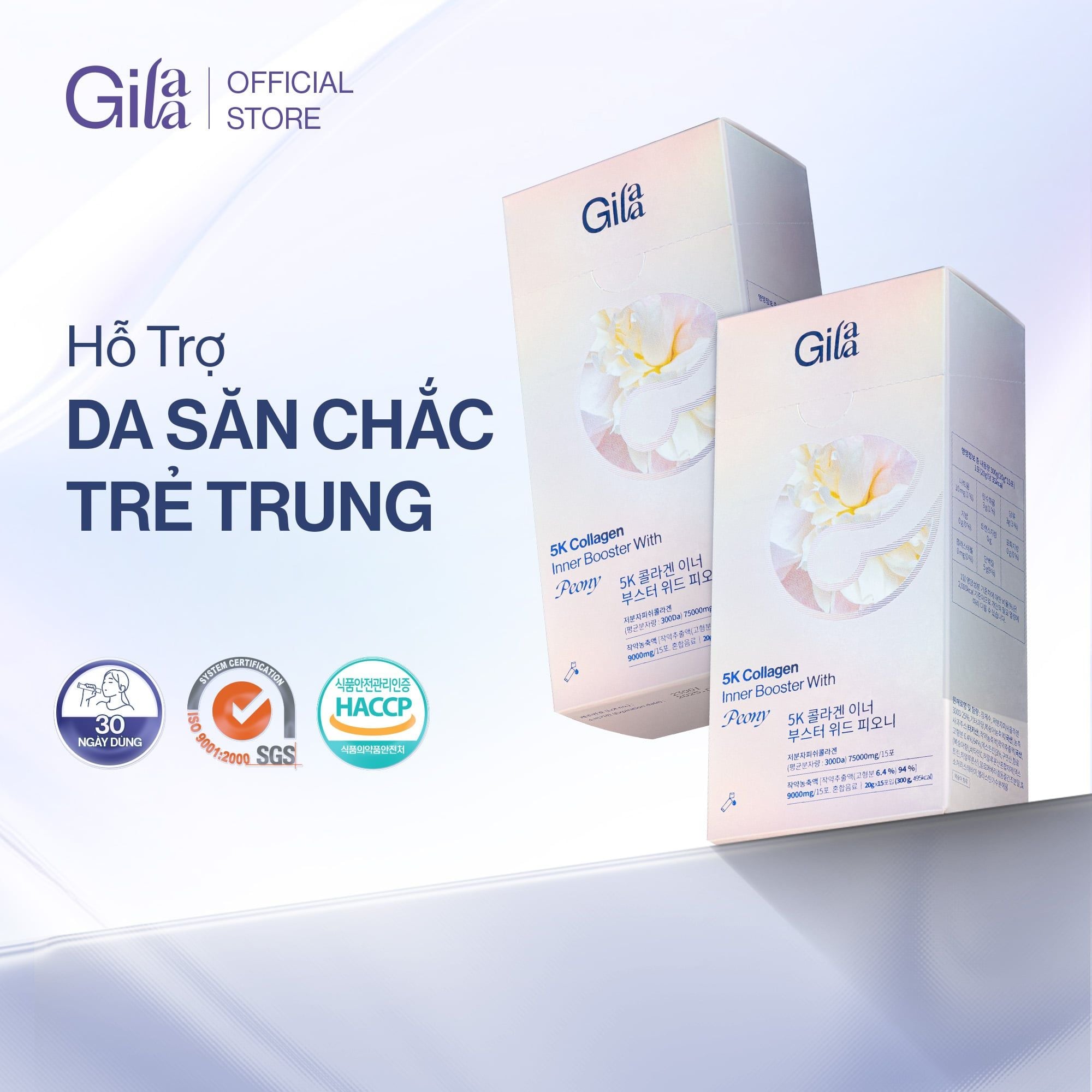 Trong 1 gói Gilaa 5K Collagen Bright Booster With Peony với thành phần chính là 5,000mg Collagen Phân Tử 300Da, kết hợp Elastin, HA & Peony. Sản phẩm giúp bổ sung collagen & dưỡng chất cần thiết, hỗ trợ da tăng đàn hồi săn chắc & sáng mịn từ sâu bên trong.
