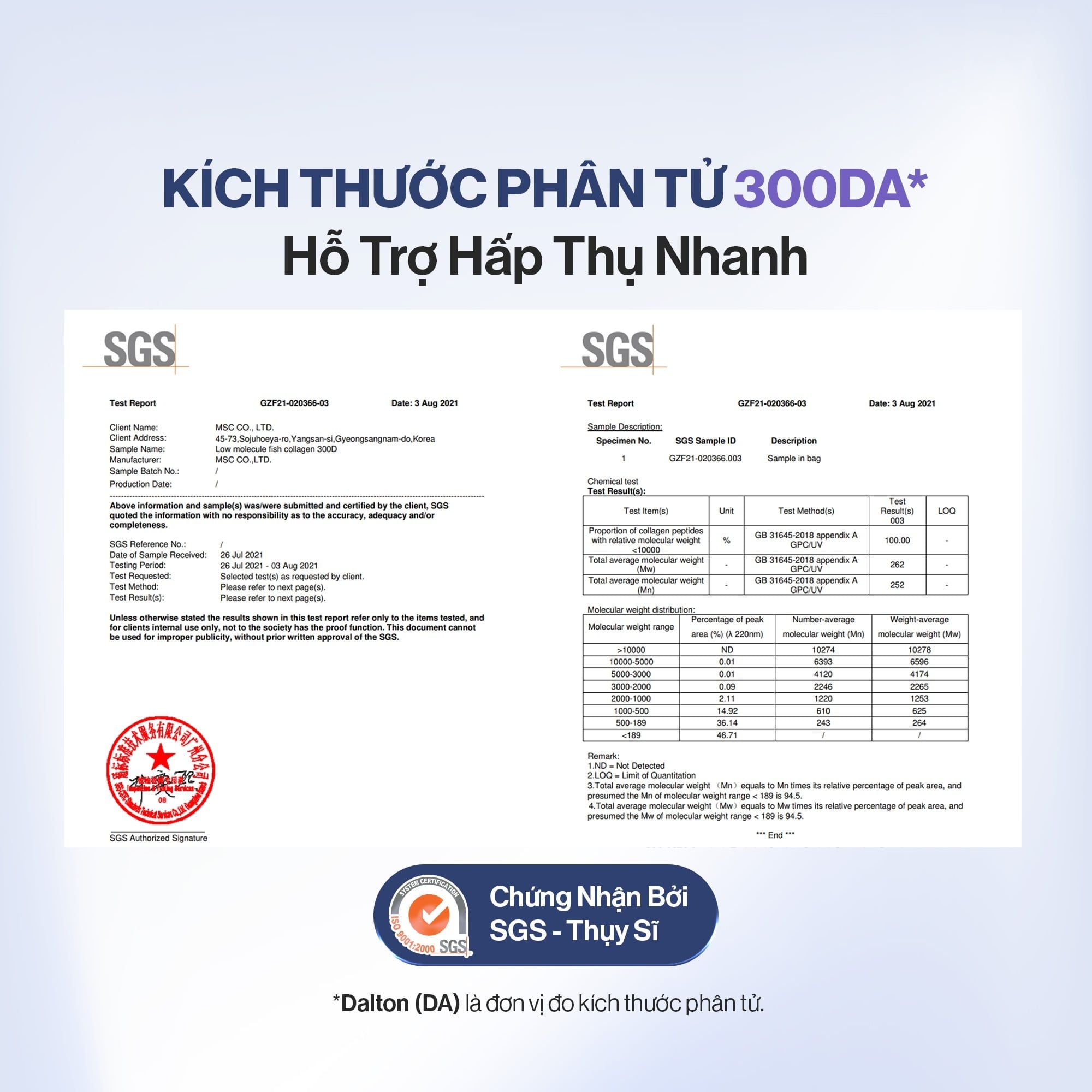 + Kích thước phân tử Collagen 300Da được tổ chức kiểm định SGS Thụy Sĩ xác nhận