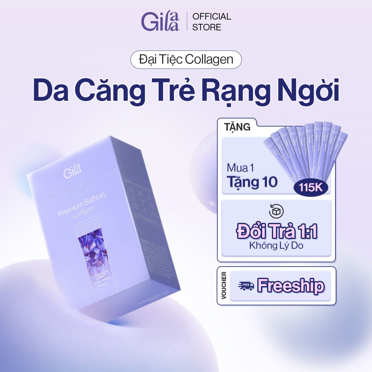 Trong 2 gói Gilaa Premium Saffron Collagen kết hợp các thành phần cao cấp hỗ trợ bổ sung collagen & dưỡng chất từ sâu bên trong, giúp da duy trì độ căng bóng trắng khỏe